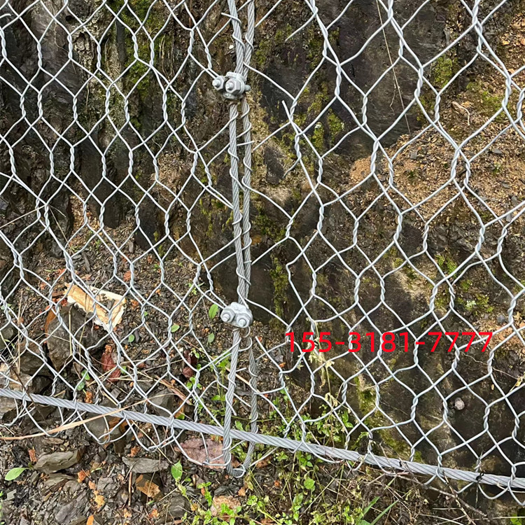 在坡面均匀布置一系统锚杆,相邻锚杆的水平及竖向间距一般为3m,此处坡面凹凸不平,锚杆布置时可适量调整,尽量将锚杆布置于坡面低凹处,在坡顶的一排锚杆上安装上支撑钢丝绳,用于固定Steelgrid高强加筋网;坡顶处,网面折叠反包并固定在上支撑绳上,网面在自重作用下自然垂挂于坡面;在坡面其它锚杆上按照设计的形式穿插并张拉支撑绳,用于将网面紧压在坡面上,以获得稳定的加固性能。