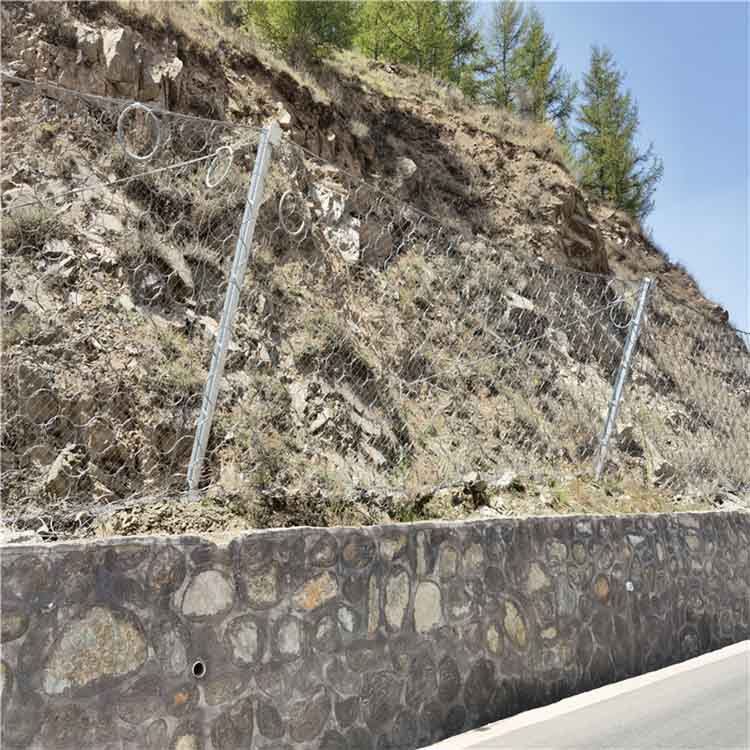 被动网是由钢丝绳网、高强度铁丝格栅网、锚杆、工字钢柱、上下拉锚绳、消能环、底座及上下支持绳等部件组成。被动网由钢柱和钢丝绳网团结组合组成边坡防护网,对所防护的区域形成坡面防护,从而阻止坍塌岩石的下坠,起到边坡防护的效果。
