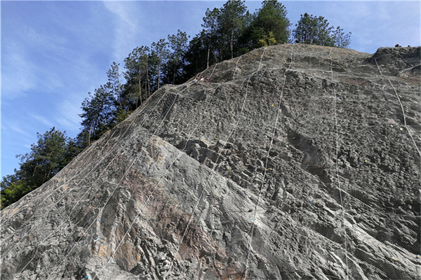 安装锚杆并注浆,注浆插入锚杆,锚杆外露环套顶端不能高出地表,且环套段不能注浆,以确保支撑绳张拉后尽可能紧贴地表。采用不低于M20的水泥砂浆灌注,孔内应确保浆液饱满,锚固后的锚绳抵拔力不得小于50KN。安装并张拉、锚固纵横向支撑绳安装纵横向支撑绳,张拉紧后两端后各用2~4个(支撑绳长度小于15m时为2个,大于30m时为4个,其间为3个)绳卡与锚杆外露环套固定连接。
