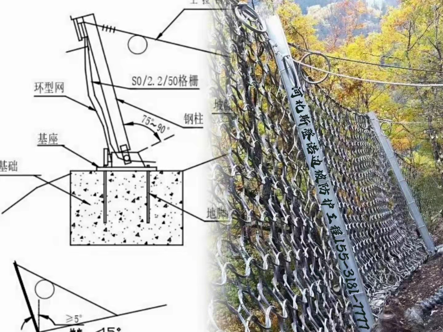 钢丝格栅:当需要拦截小块落石时,应配置钢丝格栅,宜选用网孔直径为50mm*50mm的钢丝格栅,钢丝绳网与钢丝格栅,钢丝绳网与钢丝格栅间应采用1.2mm的铁线绑扎,绑扎间距不宜小于1米。