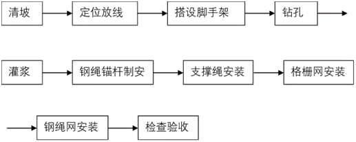 从上向下铺挂格栅网,格栅网间重叠宽度不小于5cm,两张格栅网间的缝合以及格栅网与支撑绳间用φ1.5铁丝按1m间距进行扎结(有条件时本工序可在前一工序前完成即将格栅网置于支撑绳之下。)