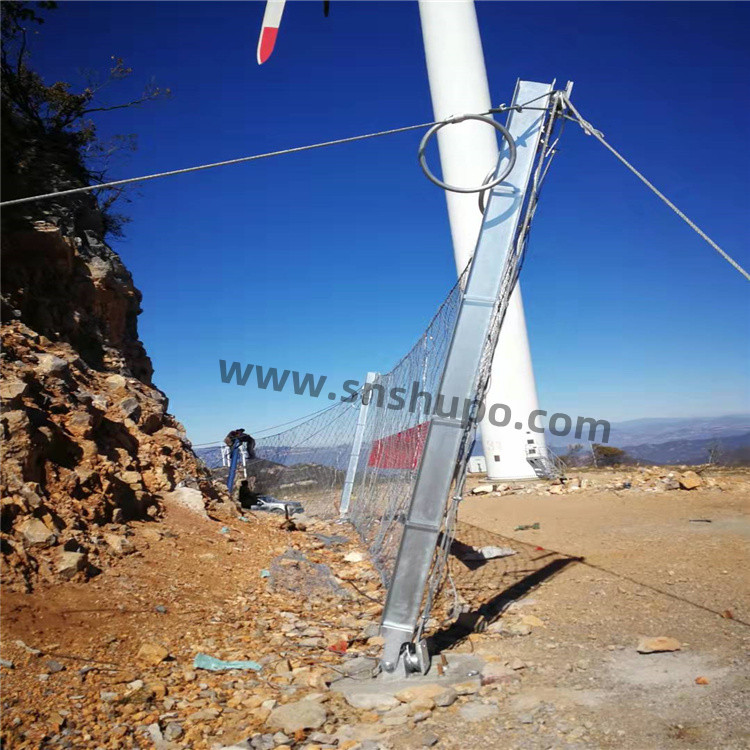 上支撑绳和减压环设备。防护网上支撑绳有单绳和双绳两种,施工工艺根本类似,均悬挂在钢柱顶端的挂座处。该工序要注意: 减压环的设备方位, 应距钢柱约 50cm,且同一根支撑绳上每一跨的减压环均相关于钢柱对称,能起到整体受力的作用。