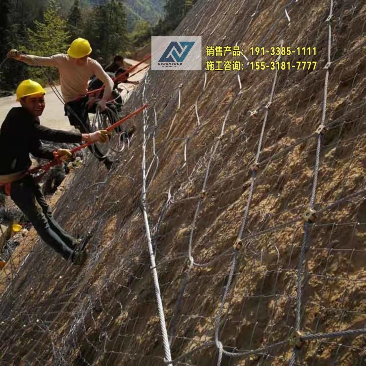 接着是放线、测量、定位。边坡防护网的放线可用水平仪来完成,测量出钢柱定位点,在间距8-12米范围内可调整钢柱,尽量错开不利地形。定好拉锚绳所在位置,边坡防护网拉绳有两种定位固定方式:一种“人”字型,一种“1“字型,要让拉锚绳两根绳长度相同。