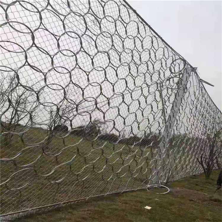 构造:主要由钢丝绳网或环形网四局部组成,(以一层铁丝格栅截断小块岩屑)、固定系统(锚杆、锚索、底座、支撑绳)、减压环、钢柱。常用规格:[钢柱(间距10米)。