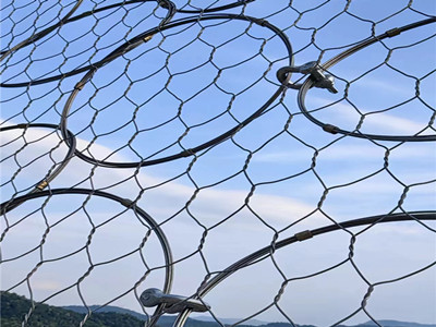 GPS-H环形主动防护网,它是由一层钢丝缠绕的环形网和机编六角铁丝网组成的,GPS-H环形主动网钢丝丝径2.2mm,钢丝的缠绕圈4圈,网孔直径为350mm,所以也称为(R4/2.2/350)型主动环形网。
